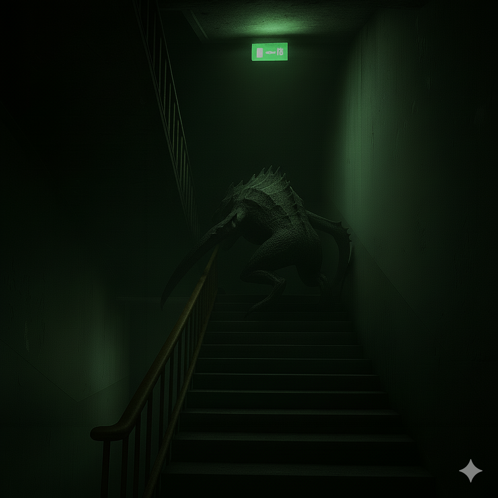 Im letzten Moment sieht Max noch erleuchtet durch Mündungsfeuerblitze etwas, das die Treppe hochkommt und zieht Liam zurück. Max positioniert sich und versucht – verdeckt durch die angelehnte Tür – in den Treppenaufgang zu spähen. Ein Wesen mit sensenartigen Vorderläufen und einem runden mit Zähnen bewehrten Maul läuft vorbei nach oben, weitere Schüsse ertönen. Alle beschließen zusammen nach draußen zu schleichen. Während sich Liam überraschend leise bewegt, schafft es Max nur dank dem [Chaos überall Aspekt getaggt], Goran hingegen fängt sich beim Herausschleichen [Aspekt Wasser im Ohr] ein.
