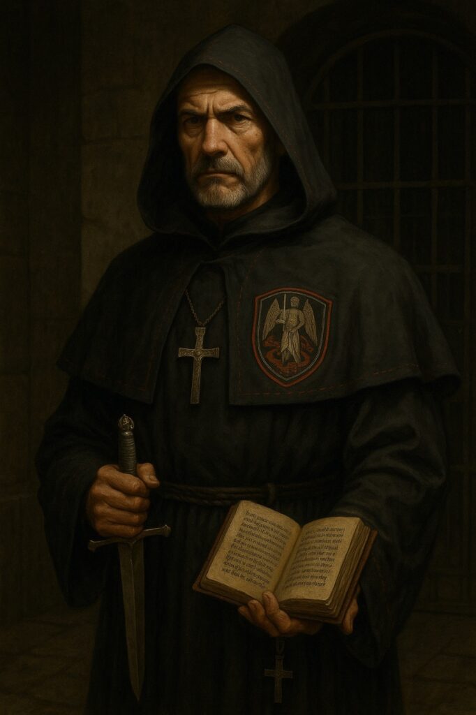 Etwas metallenes mit Ketten wird in den Raum geworfen und ein Kräuterduft breitet sich auf. Dann betritt ein Mann in Roben den Raum. Er sieht ein bisschen aus wie ein mittelalterlicher Mönch mit einem leuchtenden Kreuz auf der Brust. In einer Hand hält er ein geöffnetes Buch und in der anderen ein Dolch, den jedoch an der Klinge gegriffen hat. Immernoch rezitiert er etwas, wie es schon durch die Tür zu hören war.